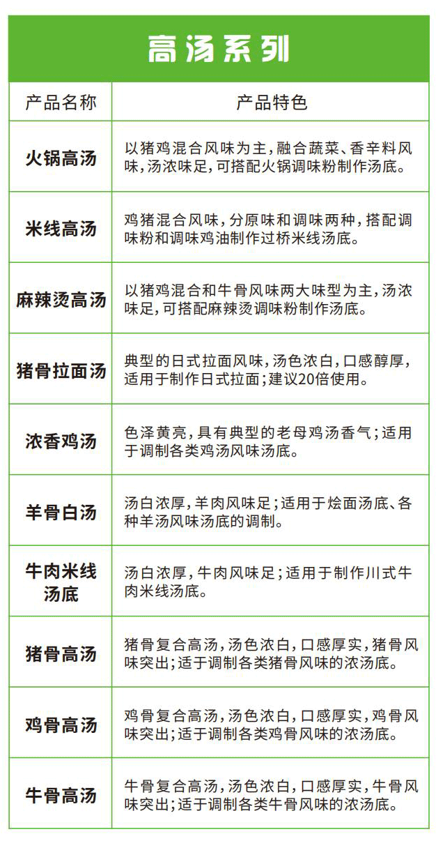 海鲜汁W-62 海带汁W-1000 精制蛤蜊浓缩汁W-3208 蛤蜊粉F-3211 鳕鱼粉F-3030 蛎虾汁L-3032 虾粉F-3035 鸡肉粉F-5227 牡蛎粉F-3073 海带粉F-3225 调味鸡油KD-1003 鸡骨清汤W-5000 鸡骨白汤W-5001 鸡骨白汤粉F-5007 鸡骨油W-5006 牛骨清汤W-6000 牛骨白汤W-6001 牛骨油W-6006 牛骨白汤粉F-6007 扇贝汁W-3183 鳀鱼粉F-3052